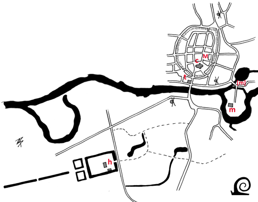 towns defences a manor house (h) stands, here directly adjacent to the watermill